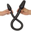 Niezwykle elastyczne podwójne dildo od Rebel z wtyczką na każdym końcu. W przypadku zabaw solo, wkładaj jednocześnie do pochwy i analnie; w przypadku zabaw dla dwojga, każde z Was może sobie zafundować jedną z zatyczek. Piękna jedwabista, śliska powierzchnia. Czarny.