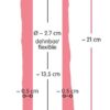 Długość całkowita 21 cm, głębokość wprowadzenia 13,5 cm, zewnętrzna-średnica˜ 4 cm, wewnętrzna-średnica˜ 2,7 cm (nierozciągnięta), otwór średnica˜ na jądra 2,5 cm (bardzo rozciągliwy). Materiał: TPE.