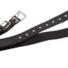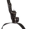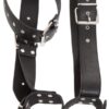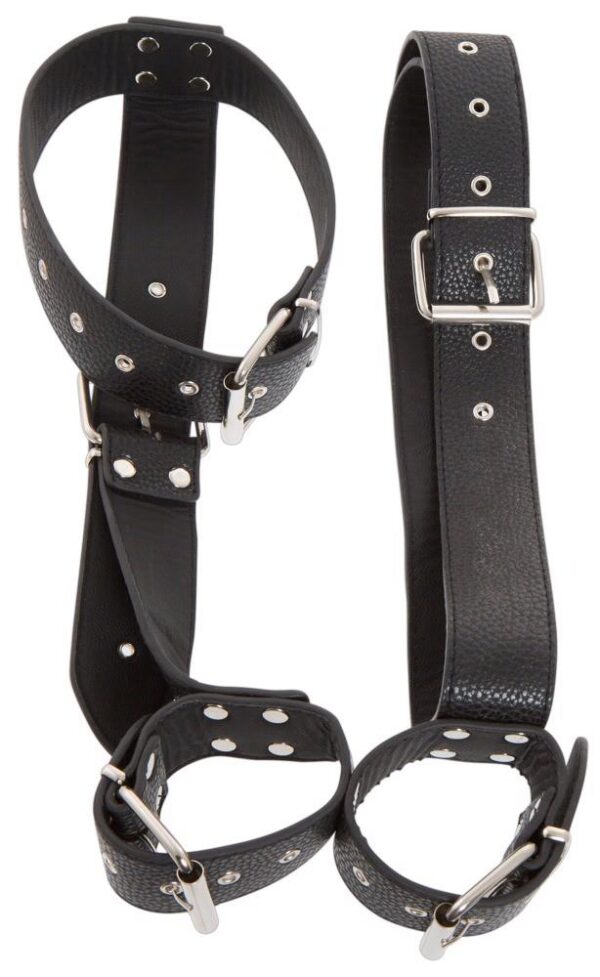 Solidna konstrukcja wykonana z czarnej imitacji skóry: mankiet na szyję i pas biodrowy połączone mocnym, nitowanym paskiem tylnym, do którego przymocowane są kajdanki jedna nad drugą.