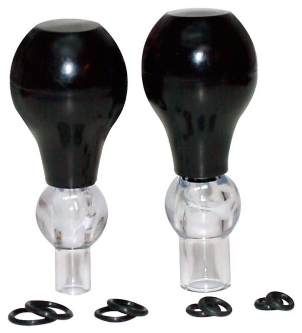 Dwie pompy ssawkowe plus 8 pierścieni mocujących w zestawie. Wystarczy nasunąć jeden z pierścieni na otwór pompy i założyć otwór na złączkę. Następnie delikatnie wciśnij pompkę – uczucie jakby Twój partner delikatnie na nią ssał! Próżnia powoduje, że brodawki sutkowe pięknie puchną – i pozostają sztywne, gdy pierścień mocujący wsuwa się na brodawkę sutkową.