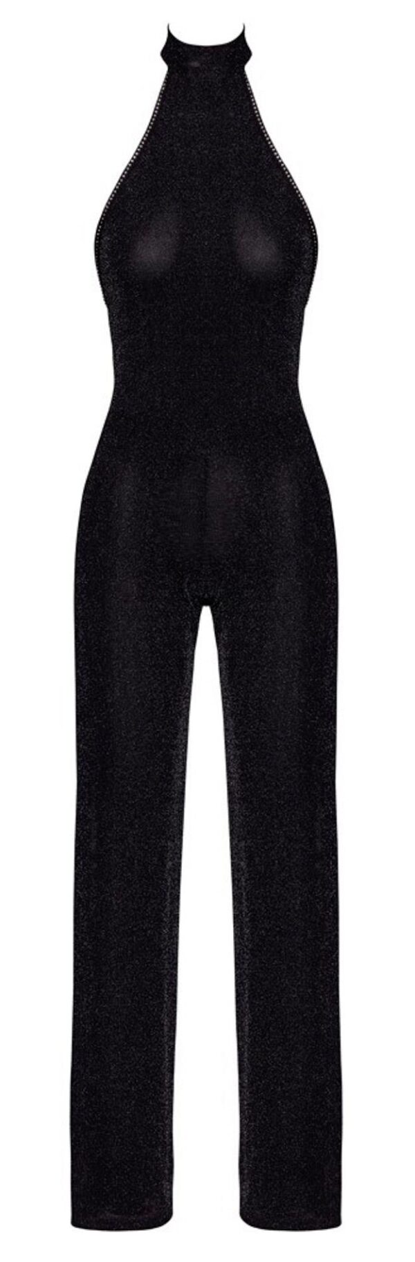Model ma proste nogawki oraz zmysłowy halter z małym, stojącym kołnierzykiem, zapinanym na haftkę z tyłu szyi. Plecy pozostają kusząco odkryte aż po pośladki, co podkreśla kobiece kształty i dodaje stylizacji erotycznego charakteru.