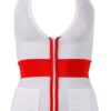 Uwodzicielska sukienka wykonana z białego powernetu z czerwonymi wstawkami w kształcie krzyża z przodu. Zamek błyskawiczny na całej długości prowadzi przez wydłużoną wstawkę, krzyżująca się wstawka podkreśla talię. Z małymi kieszeniami z przodu do przechowywania wszelkiego rodzaju akcesoriów, dwa paski do pończoch i halter neck na szyi dla zniewalającego tyłu. Mała biała opaska na włosy z czerwoną falbanką sprawia, że stylizacja jest perfekcyjna.
