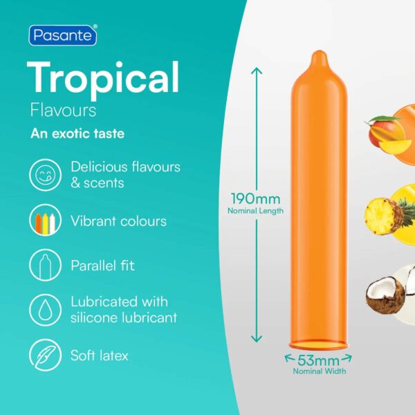 Dodaj nutkę tropików do swoich zmysłowych uniesień z Pasante Tropical – zestawem prezerwatyw w trzech egzotycznych smakach: Mango (pomarańczowe), Ananas (żółte) oraz Kokos (naturalne). Gładkie, proste i zakończone zbiorniczkiem – zapewniają komfort i bezpieczeństwo.