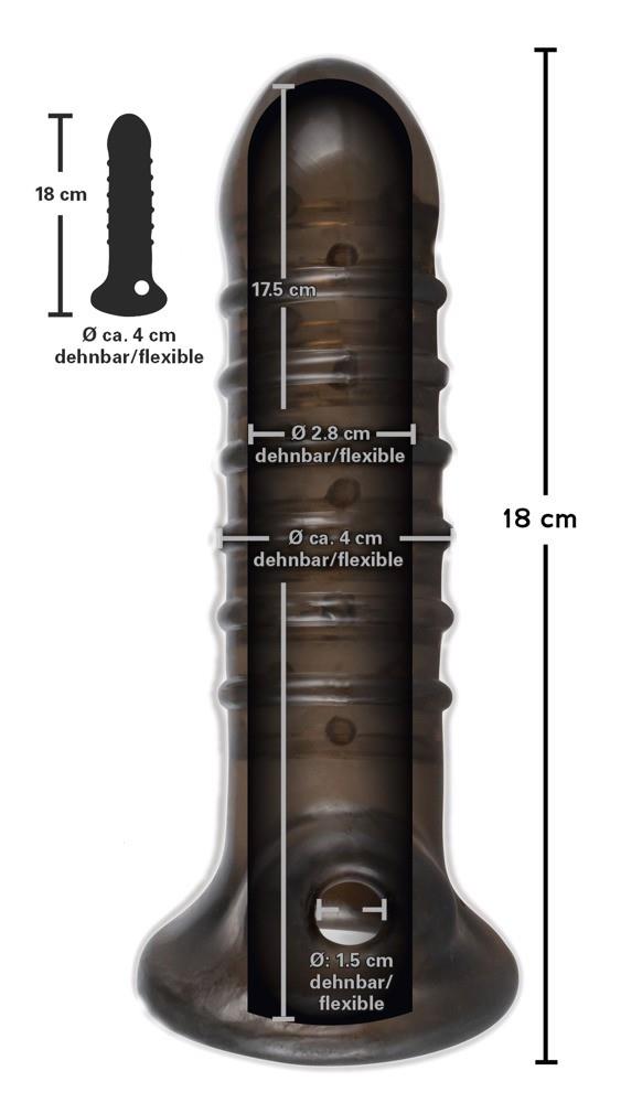 Długość całkowita 18 cm, głębokość wkładania wewnątrz 17,5 cm, na zewnątrz 14 cm, wewnątrz średnica 3 cm (rozciągliwy). TPR.