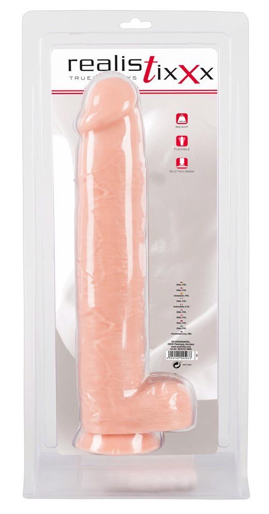 Wyjątkowo duże realistyczne dildo z charakterystycznymi żołędziami i wyraźnymi żyłkami dla szczególnie intensywnego uczucia przyjemności. Z jąderkami i silną stopą ssącą dla przyjemności oddychania.