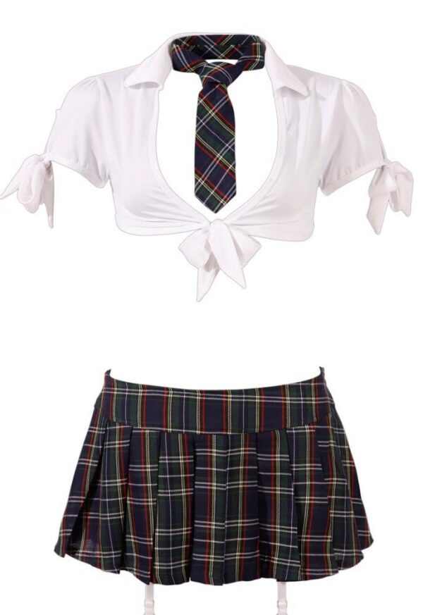 Ścisły krawat i bobbing mini z boku z zamkiem błyskawicznym, krótki top z przodu i na ramionach do wiązania oraz majteczki ouvert z seksownym widokiem na tyłek.