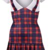 Ta sukienka to idealny mundurek szkolny. Na wierzchu w postaci białej bluzki z krótkim rękawem, kołnierzykiem i niskim dekoltem oraz z naszytą częścią spódnicową w niebiesko-czerwoną kratę, której naszyte ramiączka sięgają ponad biust i krzyżują się na plecach. Z krótką plisowaną spódniczką i dwoma białymi szelkami z przodu.