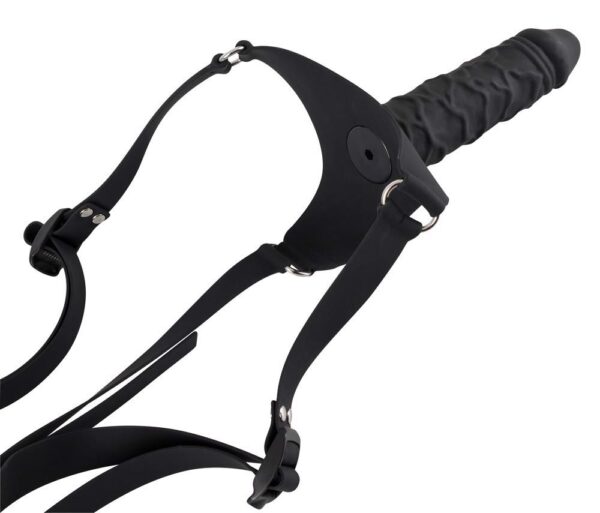Ten czarny, silikonowy strap-on od You2Toys wyróżnia się solidnym dildo z wyraźną żołędzią i żyłkami. Krótkie paski ze sprzączkami po lewej i prawej stronie umożliwiają nie tylko regulację obwodu w talii, ale także skrócenie go w razie potrzeby.