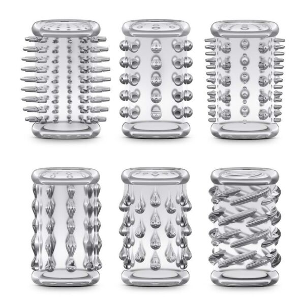 Zestaw rękawów Cock z 6 kształtami i teksturami do wypróbowania! Te rozciągliwe rękawy wzmacniające to prosty sposób na dodanie nowego poziomu przyjemności i doznań.