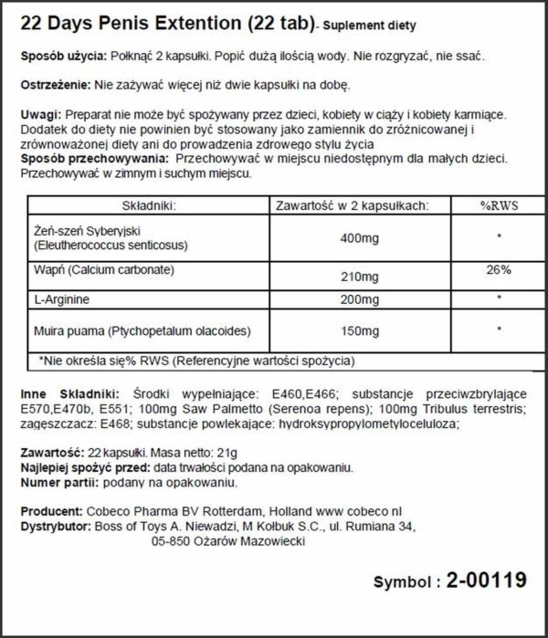 22 Days PE zawiera równiez aktywne skladniki zwiekszajace popęd, moc, potencje I libido.