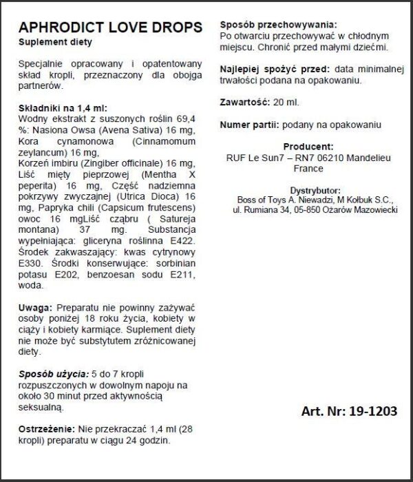 Preparat, który może wpływać na potęgowanie doznań seksualnych oraz przyspieszenie osiągnięcia orgazmu. Regularne stosowanie pozwala na czerpanie większej radości z seksu i umożliwia poprawienie jakości życia seksualnego. Może nasilać pożądanie i ochotę na seks, zwiększa intensywnośc i ilość osiąganych orgazmów. Preparat przeznaczony jest dla osób z trudnościami osiągania orgazmu, obniżonym pobudzeniem seksualnym lub osłabionym pożądaniem. L-arginina zawarta w kroplach jest prekursorem tlenku azotu, który wpływa na lepszy dopływ krwi do narządów płciowych, co może zwiększać wrażliwość na bodźce seksualne, wpływać na erekcję u mężczyzn, osiąganie orgazmu i pobudzenie seksualne u kobiet. Pozwala to na pełne odbieranie doznań w trakcie stosunku płciowego.