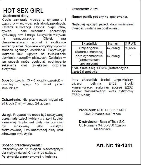 Hot Sex Girl to krople o działaniu wspomagającym podniecenie. Afrodyzjak został specjalnie opracowany dla rozszerzenia pociągu seksualnego u kobiet. Krople mogą być łączone z najróżniejszymi napojami nie zmieniając smaku, a ich konsekwencją jest wzmocnienie pożądania u kobiety. Wywiera pozytywny wpływ na pogłębienie podniecenia seksualnego oraz powiększenie doznań erotycznych. Prawidłowo wpływa na aktywność orgazmów. Ekstrakt z cząbru i cynamon mogą działać pobudzająco i wzmagają kondycję fizyczną.