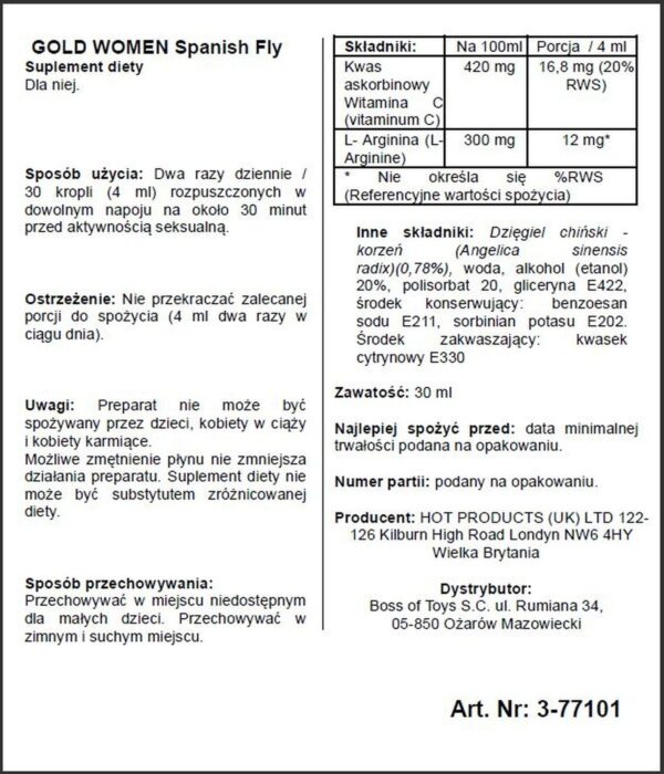 Hiszpańska Mucha Spanish Fly Gold Women Strong to suplement diety, który ma za działanie skutecznie pobudzić, zwiększyć libido oraz wzmocnić i wydłużyć orgazm. Posiada naturalny skład, który jest bezpieczny dla zdrowia.
