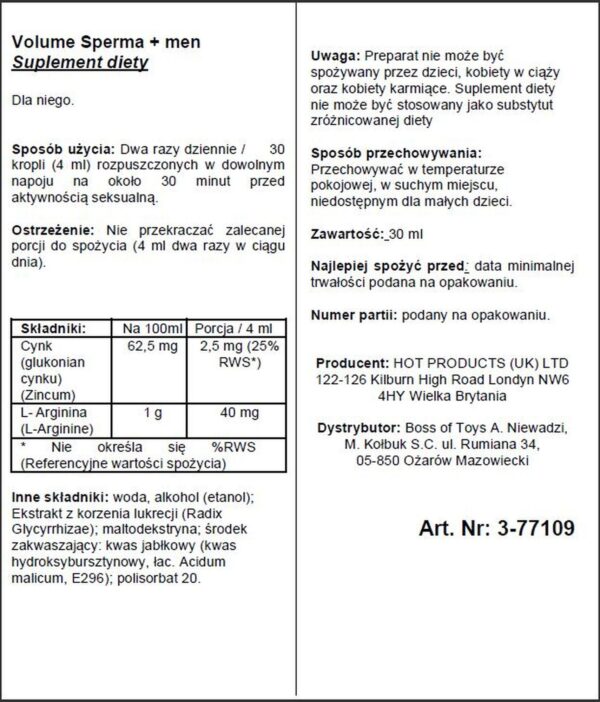 Krople Ero Drops Volume Sperma + men to produkt zwiększający ilość spermy a także jej jakość. Środek jest naturalny, ze specjalnie skomponowanych składników aby nie tylko zwiększyć ilość produkowanej spermy ale głównie po to aby przedłużyć Wasze współżycie.