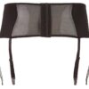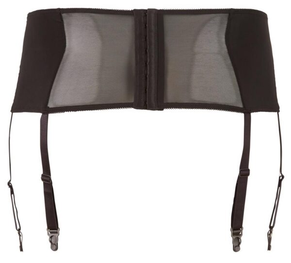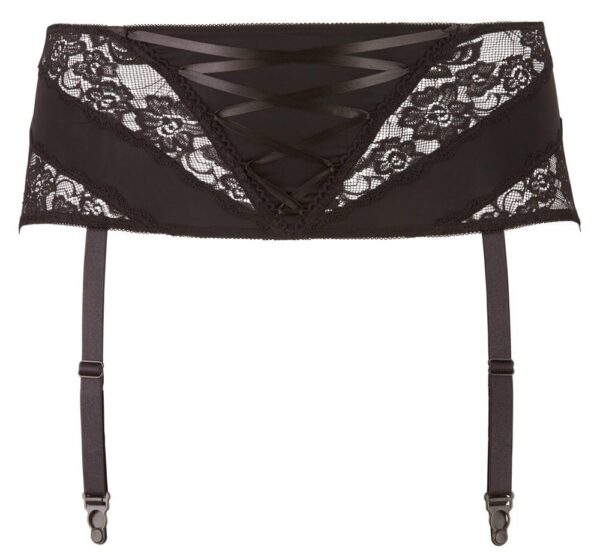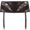 Ten czarny pas do pończoch z koronkowymi wstawkami i małym sznurowaniem z przodu jest ozdobą następnego uwodzicielskiego stroju. Cztery regulowane szelki utrzymują pończochy na miejscu. Z tyłu zapięcie na haftkę.
