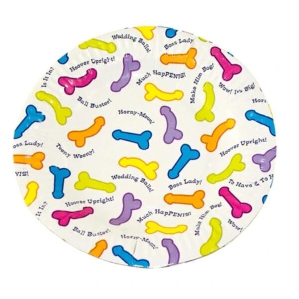Okrągłe talerzyki papierowe w kolorze białym z nadrukowanymi penisami, średnica ok. 18cm.