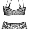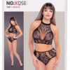 Top i figi bez krocza marki NO:XQSE o różnych strukturach siatki. Top z elastycznym paskiem na szyję, z tyłu elastyczne paski. Wysoko wycięte majtki z zapraszającym otwarciem w kroku. Wszystkie wykonane bezszwowo i bardzo elastyczne dla wyjątkowo przyjemnego komfortu noszenia.