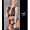 Top, pasek do pończoch i sznurek w połączeniu z przezroczystą koronką i czarnym mokrym wyglądem. Chmurka to szybko otwierające się zapięcia zatrzaskowe nad biustem oraz kajdanki z zapięciem na rzepy, które można szybko zawieszać i wyjmować dzięki karabinkom na ozdobnych pierścieniach górnych i pasie do zawieszania. Tak więc zestaw bielizny szybko staje się specjalnym zestawem niewolniczym dla początkujących!