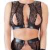 Top, pasek do pończoch i sznurek w połączeniu z przezroczystą koronką i czarnym mokrym wyglądem. Chmurka to szybko otwierające się zapięcia zatrzaskowe nad biustem oraz kajdanki z zapięciem na rzepy, które można szybko zawieszać i wyjmować dzięki karabinkom na ozdobnych pierścieniach górnych i pasie do zawieszania. Tak więc zestaw bielizny szybko staje się specjalnym zestawem niewolniczym dla początkujących!