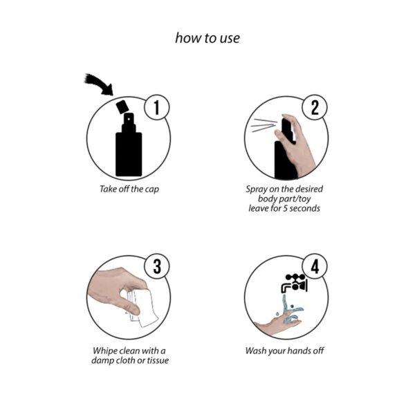 Sposób użycia: rozpyl preparat na wybraną część ciała lub zabawkę, pozostaw na około 5 sekund, a następnie wytrzyj wilgotną ściereczką lub chusteczką.