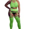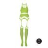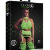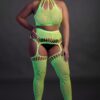Uwolnij swoją wewnętrzną boginię dzięki tej oszałamiającej bieliźnie aktywowanej promieniami UV. Ten model składa się z krótkiego topu z dekoltem wiązanym na szyi i pończoch z paskiem do pończoch. Niesamowita odzież imprezowa, która wywoła efekt wow i sprawi, że się wyróżnisz. Materiały aktywowane promieniowaniem UV dodają odrobiny tajemniczości i uroku. Łatwe w zakładaniu dzięki rozciągliwym materiałom sprawią, że rozświetlisz noc.