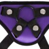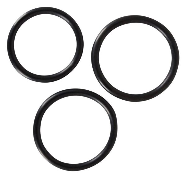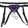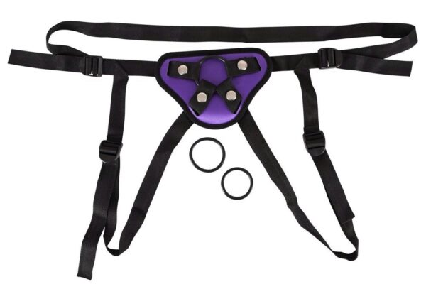 Pasek z imitacji skóry zawierający trzy pierścienie o różnych średnicach 4, 4,5 i 5 cm. Fioletowy/czarny. Maksymalny obwód: biodro 134 cm, noga 82 cm. Materiał: Kauczuk chloroprenowy (taśmy), poliester (uprząż), kauczuk nitrylowy (pierścienie), metal miedziany/cynkowany (nity).