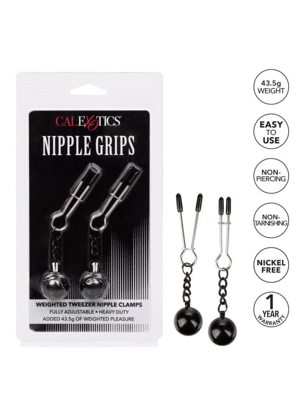 Tweezer-style nipple clamps give you the right amount of squeeze for an incredible nipple play experience. Adjust the tweezers to exactly the pressure you desire, and let the weights pull and tug for even more pleasure.