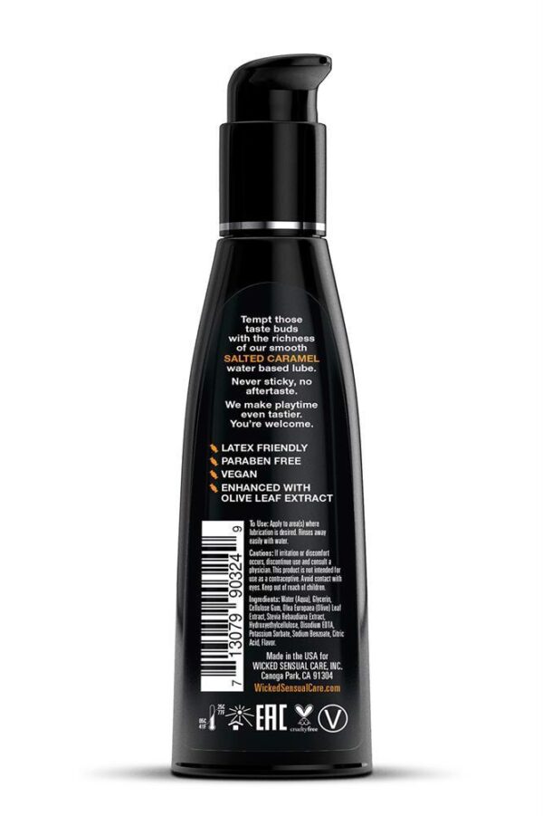 The perfect combination of savory and sweet! Kissable, lickable, and delicious, Wicked Aqua Salted Caramel personal lubricant adds subtle and delicious natural flavours to enhance oral pleasures. Light and silky, this water-based formula is the perfect sensual combination of an elegant lubricant and a flavour sensation. Never sticky and without an aftertaste, Wicked Aqua Salted Caramel satisfies your sweet tooth and your intimate desires all in one amazing pleasure product. Oral sex never tasted so good. Whether you are giving or receiving, Wicked flavours will give you a new sexy confidence. Wicked flavoured lubes are sweetened with Stevia, making them safe for oral, vaginal and anal play.120 mlLong lastingLatex friendlyParaben freeNever stickyNo aftertasteEnhanced with Olive Leaf ExtractSweetened with SteviaVegan – no animal by-products or testingUse: Apply to area(s) where lubrication is desired. Cleans away easily with water.Ingredients: Water, Glycerin, Cellulose Gum, Stevia Rebaudiana Extract, Olea Europaea (Olive) Leaf Extract, Hydroxyethylcellulose, Tetradsodium EDTA, Citric Acid, Sodium Benzoate, Potassium Sorbate, Flavour.