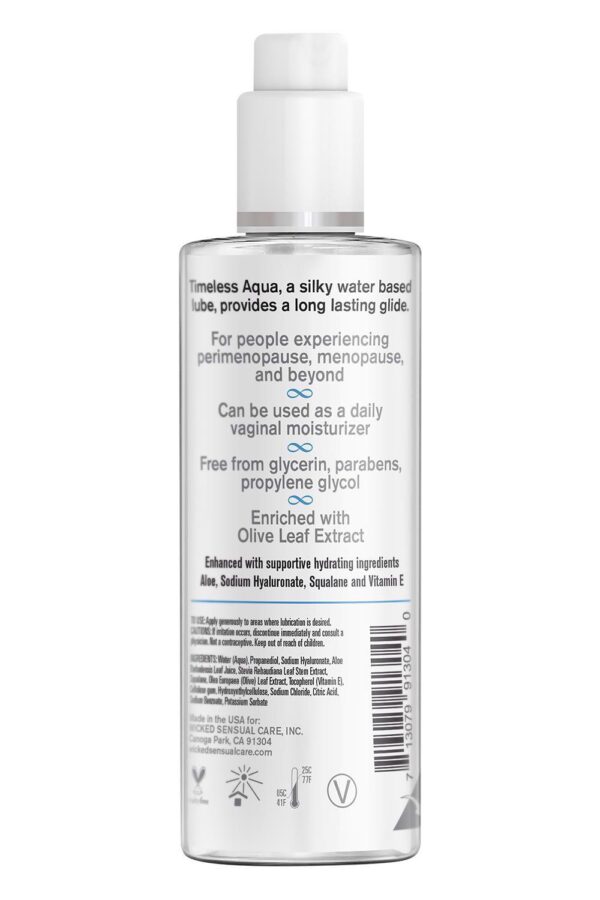 Timeless Aqua is a silky water based lube that provides a smooth, long lasting glide with extra hydration.Menopause and aging can bring about change to our bodies, but our right to prioritize pleasure remains constant. The Timeless collection by Wicked gives people different options based on individual needs and preferences, and each formula has been carefully crafted using the most innovative and rejuvenation ingredients. The Timeless collection is free from glycerin, parabens and propylene glycol. Each formula can be used as a daily vaginal moisturizer.Unique supportive ingredients provide extra moisture and hydration.Featuring expanded labels with enlarged font for easy to read consumer information and support.Vegan and cruelty free.  Supportive ingredients: Aloe leaf juice, Squalane, Vitamin E, Olive leaf extract, Sodium hyaluronate.
