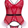 Małe koronkowe stringi dopełniają ten zmysłowy, świąteczny look.